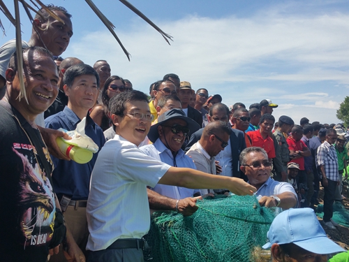 接下来,在人群簇拥下中国大使馆李代办和东帝汶总理鲁伊一行一同来到养殖池旁饶有兴致地拿起了捕捞杆和捕捞网开始了对虾捕捞仪式。随着一批批活蹦乱跳的鲜虾随着捕捞网跃出水面映入人们的眼帘,赞许声、惊叹声、掌声编织出一曲激动人心的交响乐。中东双方领导握手祝贺,这一刻,人们充满着希望与憧憬,沉浸在东帝汶美丽阳光海岸旁鲜虾丰收的欢乐场景当中。