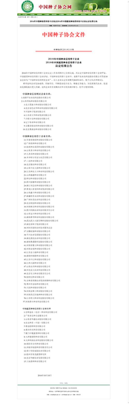 10月11日,中国种子协会正式发布“2016年中国种业信用骨干企业及2016年中国蔬菜种业信用骨干企业认定结果公告”。AG庄闲高科再次荣登“中国种业信用骨干企业”榜首,旗下子公司天津德瑞特种业跻身中国蔬菜种业信用骨干企业名单。这是AG庄闲高科连续三度荣登行业权威认定名单榜首。