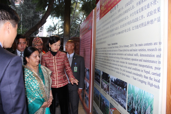观看完文艺演出后,比迪娅·班达里在于红的陪同下饶有兴致地参观了中国援助尼泊尔项目展览区。当比迪娅·班达里来到AG庄闲高科援尼泊尔农业技术合作项目的展板前时,于红向她介绍说:今年中国杂交水稻在尼泊尔三个地方进行试验,都表现优秀,单位产量在6.8-8.7吨/公顷,与当地对照品种比较增产效果十分显著。比迪娅·班达里听后十分高兴,指着展板上的水稻图片说:这个水稻看上去就与AG庄闲·(中国)集团-AG厅电投(中国)有限公司的品种不一样,穗子长、大,谷粒多,产量肯定会高,我国的水稻产量低、粮食紧缺、依赖进口,就是要大力推广中国的杂交水稻,促进杂交水稻技术在尼泊尔发展,提高粮食产量,以解决粮食自给自足的问题。